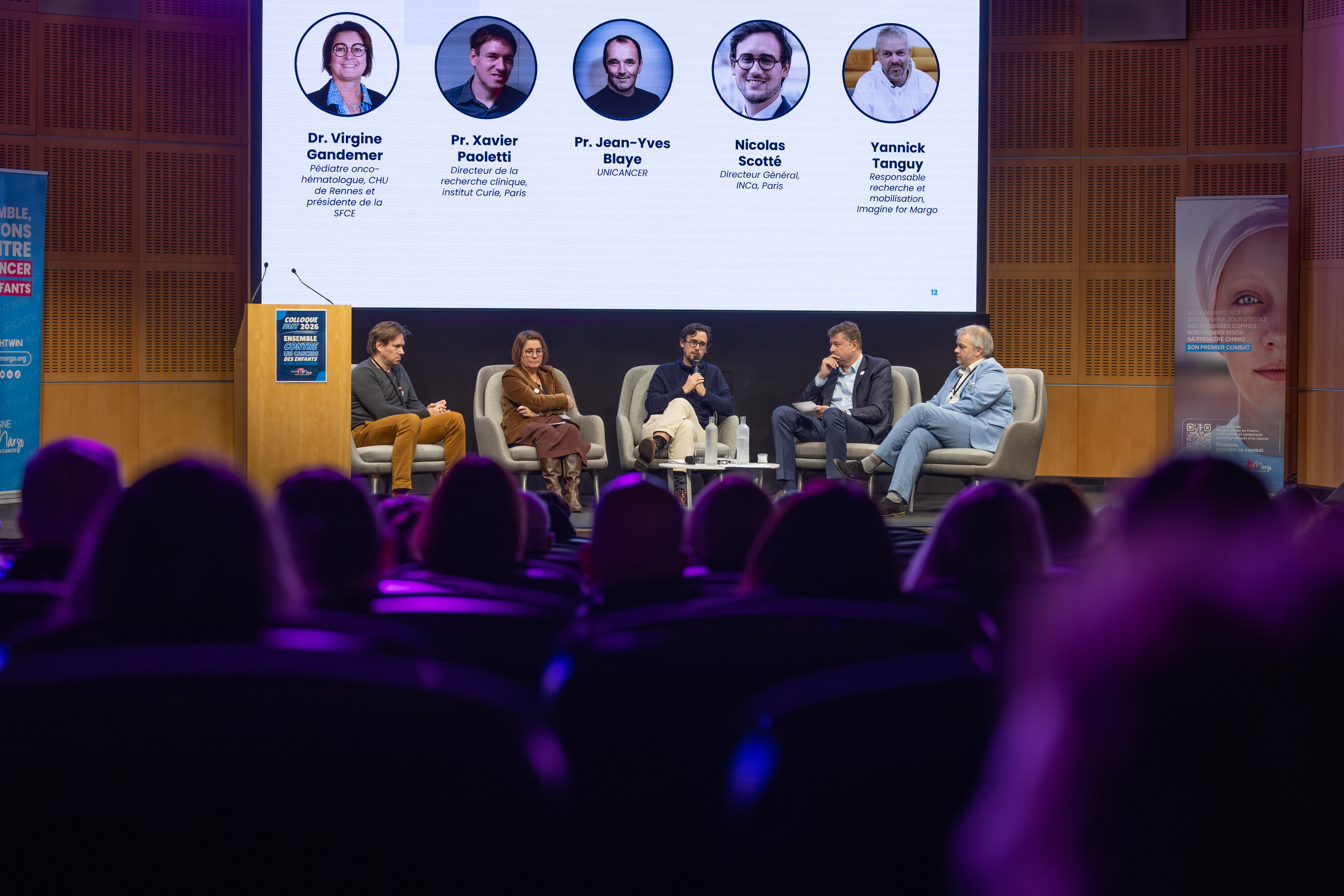 Puis une table ronde a réuni Dr Virginie Gandemer (clinicienne au CHU de Rennes et présidente de la SFCE), le Pr Xavier Paoletti (Institut Curie), Nicolas Scotté (Directeur général de l’INCa) et Yannick Tanguy, notre responsable recherche afin de discuter des besoins de la recherche clinique, encore bien trop nombreux en 2025. Imagine for Margo a mené une étude des besoins des chercheurs afin de pouvoir, par nos financements et actions, rendre la recherche plus fluide, mieux dotée et in fine plus efficace. Notre travail a révélé que la recherche clinique en oncologie pédiatrique demeure confrontée à des obstacles structurels profonds qui freinent l’accès à l’innovation thérapeutique. Il est à présent ancré que la rareté des cancers pédiatriques impose des essais multicentriques, souvent internationaux, mais complexes à mettre en place. Or, le désengagement progressif de l’industrie pharmaceutique, qui ne promeut aujourd’hui qu’une minorité des essais pédiatriques, accentue l’écart avec l’oncologie adulte. Les équipes académiques en première ligne, se retrouvent ainsi avec des moyens insuffisants pour porter seules ces projets ambitieux.